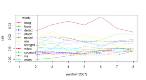 コンピュータビジョン分野の査読つき国際会議であるCVPR(Conference on Computer Vision and Pattern Recognition)の論文題名を http://www.cvpapers.com/ から取得し、その変遷をRのtmモジュールを使い分析、可視化してみました。 CVPR2007からCVPR2013まで…